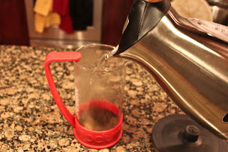 Whether you are grinding them yourself, or using ground ones, this is where you measure out how much you're putting in your press.Make you coarsely grind the beans so they don't seep through the press. I use 3-4 scoops depending on how strong I want it that day.